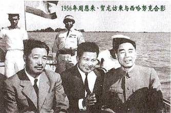 1956年周恩来访问柬埔寨。西哈努克亲王(中)与周恩来、贺龙在游艇上