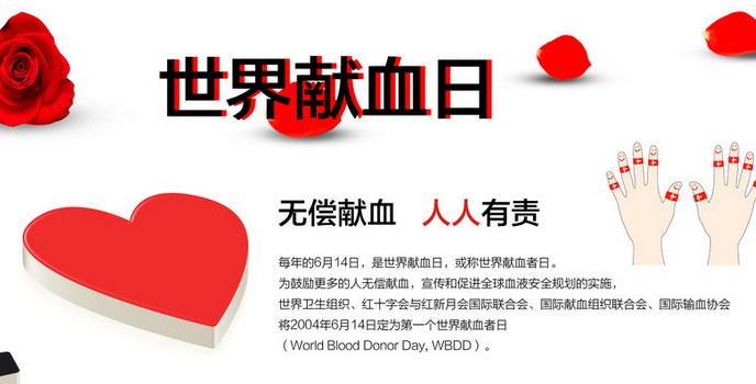 每年的6月14日,是世界献血者日。为鼓励更多的人无偿献血,宣传和促进全球血液安全规划的实施,世界卫生组织、红十字会与红新月会国际联合会、国际献血组织联合会、国际输血协会将2004年6月14日定为第一个世界献血者日(World Blood Donor Day, WBDD)。