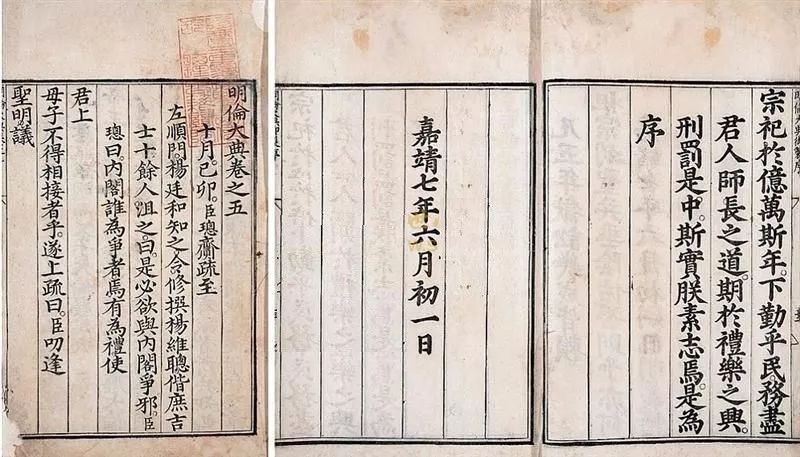 《明伦大典》24卷,8厚册,是明嘉靖七年有政府官方刊布的一本政书性质的史书。嘉靖七年六月修毕,嘉靖皇帝亲自为《明伦大典》作序,刊布天下。
